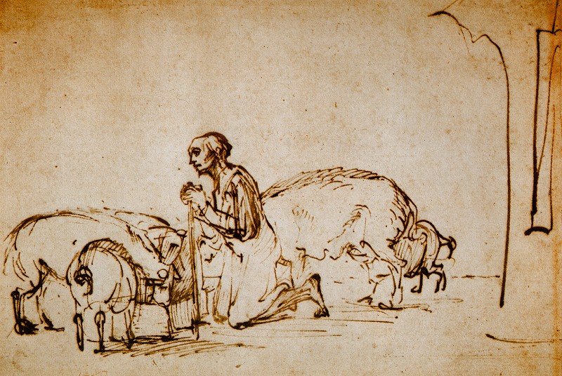 Rembrandt’s sketch from his Prodigal Son series, based on the story in Luke’s Gospel, depicts the low point of the story for the young man who has taken his inheritance in an irregular way and spent it all on hedonistic living. When it has run out, he finds himself at the lowest of ebbs, reduced to being a hired hand feeding pigs and being desperate enough to eat their food.