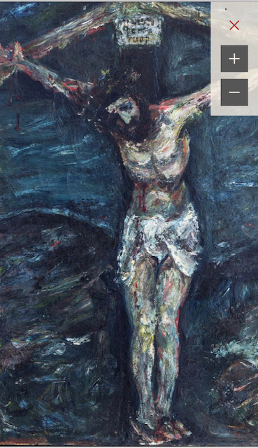 To quote from today’s commentary: In an expressive style influenced by the French–Russian painter Chaim Soutine, and inspired by Marc Chagall’s crucifixions, Castel put himself on the cross. The face is a self-portrait, while above the figure a Hebrew inscription says ‘Castel the Jew’, so that the artist’s intense outpouring of pain culminates in total identification with the suffering of the crucified Christ.